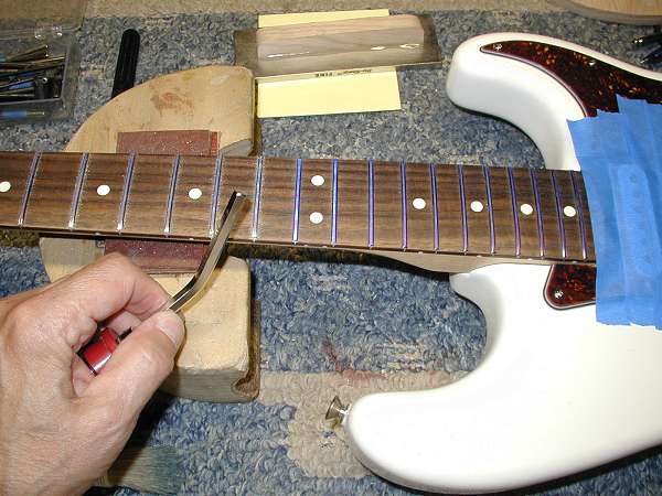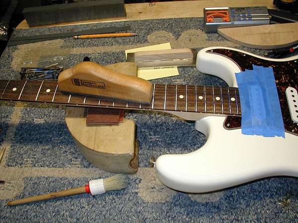Jeff W's nice new MIM Strat has several areas of low frets that require leveling to remove string buzzing and allow for better overall playability. I removed the strings, leveled the fingerboard (via the truss rod), taped off the headstock nut area and upper body area, colored the fret tops with a Sharpie pen, and began leveling the frets with a special fret level file.