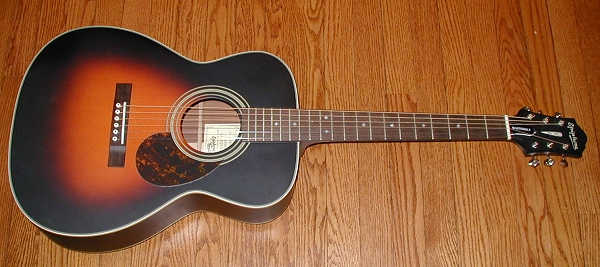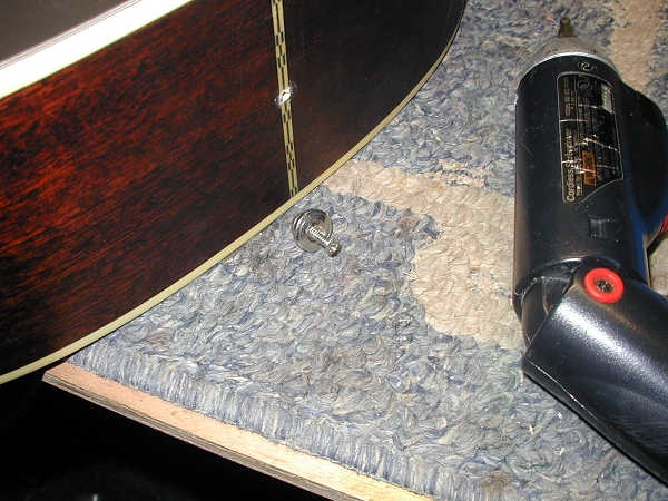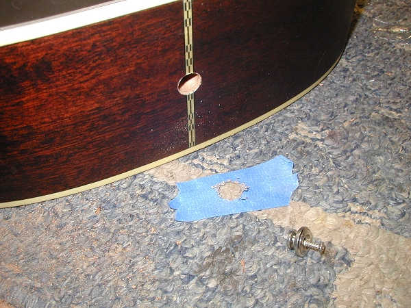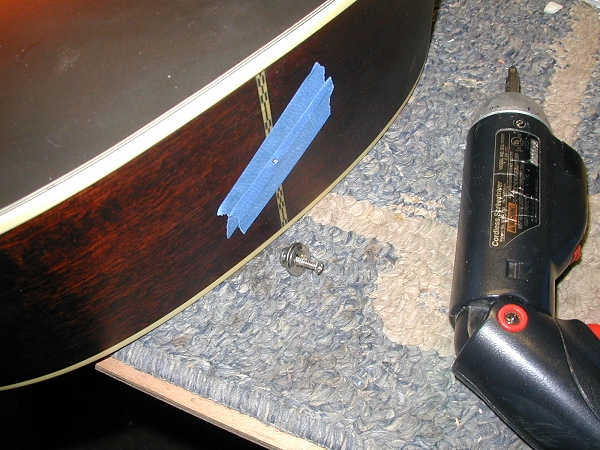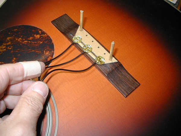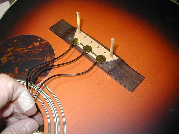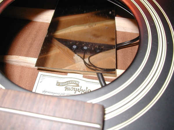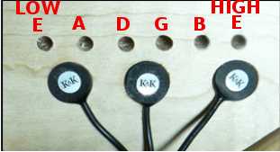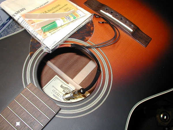K&K Pure Western Mini Acoustic Installation www.KKSound.com Rob DiStefano - FretTech Guitars & Cavalier Pickups The EF-500MVS Epiphone Masterbilt. ![]() We'll start by drilling out for the strap jack - first, remove the lower strap button. ![]() Apply masking tape over the strap button's screw hole and punch through the tape at the hole. ![]() Using a variable speed hand electric drill with a sharp 1/2" bit that you know will cut properly into hardwoods, slowly drill out for the strap jack - check to make sure you're drilling as close to 90 degrees to the guitar body as possible. I've been installing strap jacks this way for decades and it's second nature for me to use a hand drill and free-hand drill out strap jack holes. Alternatively, you could start the hole with a smaller drill bit and use progressively larger diameter bits 'til you finish up with 1/2", and/or jury rig a drill press to aid in the operation. Testing out your drill bit on a scrap wood block or board before attempting to do so on your guitar is a very very wise idea. If you have doubts about your own drilling skills and/or tools, get a pro to drill your guitar's butt hole. ![]() All done - the masking tape keeps the hole edges tidy. ![]() The K&K Pure Western Mini transducers w/attached strapjack, including a bag with double stick tape (NOTE: as of 2015, K&K no longer supplies a tube of super glue). ![]() Cut out a 3" x 1-1/4" rectangle of cardboard - I've cut mine out from the USPS Priority Mail box that the K&K was shipped in - and on one long edge mark in 3/4" from each side and cut off, forming a trapezoid. ![]() With a pencil, mark about 1/4" in on the long side of the cardboard the string hole spacing by lining up the cardboard to the string holes. ![]() Poke pencil holes only in the outer E string marks. ![]() Using a 1/8" dowel or bamboo BBQ skewer, cut off two 2" long posts and poke each into a jig E hole, leaving about 1/2" poking thru. ![]() ![]() ![]() Test fit the jig by placing it into the sound hole and poke the posts up thru the E string peg holes. You wanna make sure that the cardboard template will sit flush to the bridge plate - if it doesn't, no problem, just trim off the cardboard 'til it sits flush to the plate. For the most part, it'll work fine as is. ![]() Put the jig back on top of the guitar and into the E string holes. Draw a line on the cardboard template that corresponds to where the saddle lies. You can cut off any excess cardboard that extends over the bridge (see next image). ![]() Using the K&K supplied double stick tape, take one tape and cut off a 3/16" strip. ![]() Peel off one side of the double stick tape and lay the tape down directly over the cardboard jig's saddle line. ![]() Snip off the excess tape ends. ![]() Remove the top film layer off the double stick tape, revealing the sticky side and trim off the cardboard within about 1/8" of the black saddle line that you marked on the cardboard jig. ![]() With the gold foil side of the transducers facing UP, place each transducer down on top of the double stick tape, on the center of the saddle line, with each transducer situated about in the middle of each pair of string holes. NOTE: K&K Sound now recommends placing the B/E transducer closer to, or directly over the high E string plate hole, to augment the the treble ... ![]() ![]() Clean each transducer foil with a clean paper towel - naphtha (lighter fluid) is a good cleaning agent. Also, using naphtha on a piece of paper towel, clean the area on the bridge plate (inside the guitar) where the transducers will get glued. Apply a generous amount of superglue to each gold foil. NOTE: before opening up a tube of superglue (CYA) near your beloved guitar, do what I didn't do and cover the entire guitar top with plastic food wrap film or painter's low tack masking tape, cut out for the sound hole and poke through at the bridge E string holes. You wouldn't wanna take a chance of dripping that nasty goop on yer guitar top! ![]() Lower the jig into the sound hole and push the posts up thru the E string holes, press the jig onto the bridge plate and hold for a good 30 seconds. Wait at least five more minutes for the goop to set up hard. ![]() ![]() Pull out the jig dowel posts, get your hand into the sound hole and carefully peel away the cardboard jig. The strip of double stick tape may or may not remain on the cardboard - either leave or wait a half hour or so for the superglue to fully cure and then peel off the tape. Most importantly, you can see the each transducer is perfectly located. You can see in this image that I peeled off the double stick tape and it also pulled off one of the logo decals on the far right transducer - no big deal. ![]() Run a wire (a plain G string works fine) through the 1/2" strap jack hole, put a slight 3/16" bend on the inside end and hook it onto one of the strap jack end holes. Using this jack "fish" wire, pull the jack through the guitar's strap jack body hole. Adjust the jack's body length for the best fit on your acoustic - this may mean test fitting the jack several times after adjusting the body length. When the fit is right, lock it on *tight*. ![]() All done! ![]() |