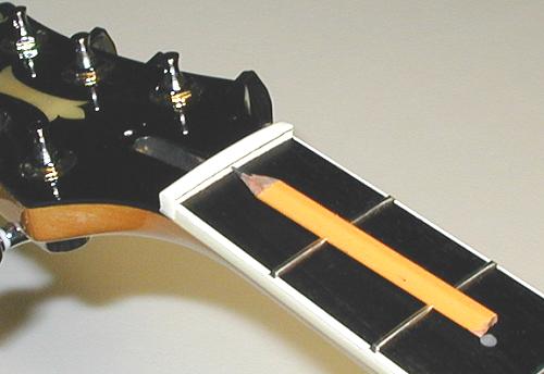 Here, I use a "half pencil" to scribe the fret height on the new nut blank - it's just a reference line and I don't wanna cut below that or I'll "blow the nut". After you get some serious nut cuttin' chops, you won't need this line - but for now, use it because ... A) if the fretboard nut slot is curved, drawing the radius on the nut blank allows you to sand in the proper board radius onto the nut bottom so that it will seat properly inside the nut slot, and contact all of the wood with no gaps or flat spots, B) whether the fretboard nut slot bottom is curved or flat, once the nut blank is seated in the fretboard nut slot, use the half pencil to scribe a line on the nut blank - this line indicates two things: 1) you'll grind down the excess nut blank top to within about 3/32" of that line, and 2) you never wanna cut a string slot below that line!